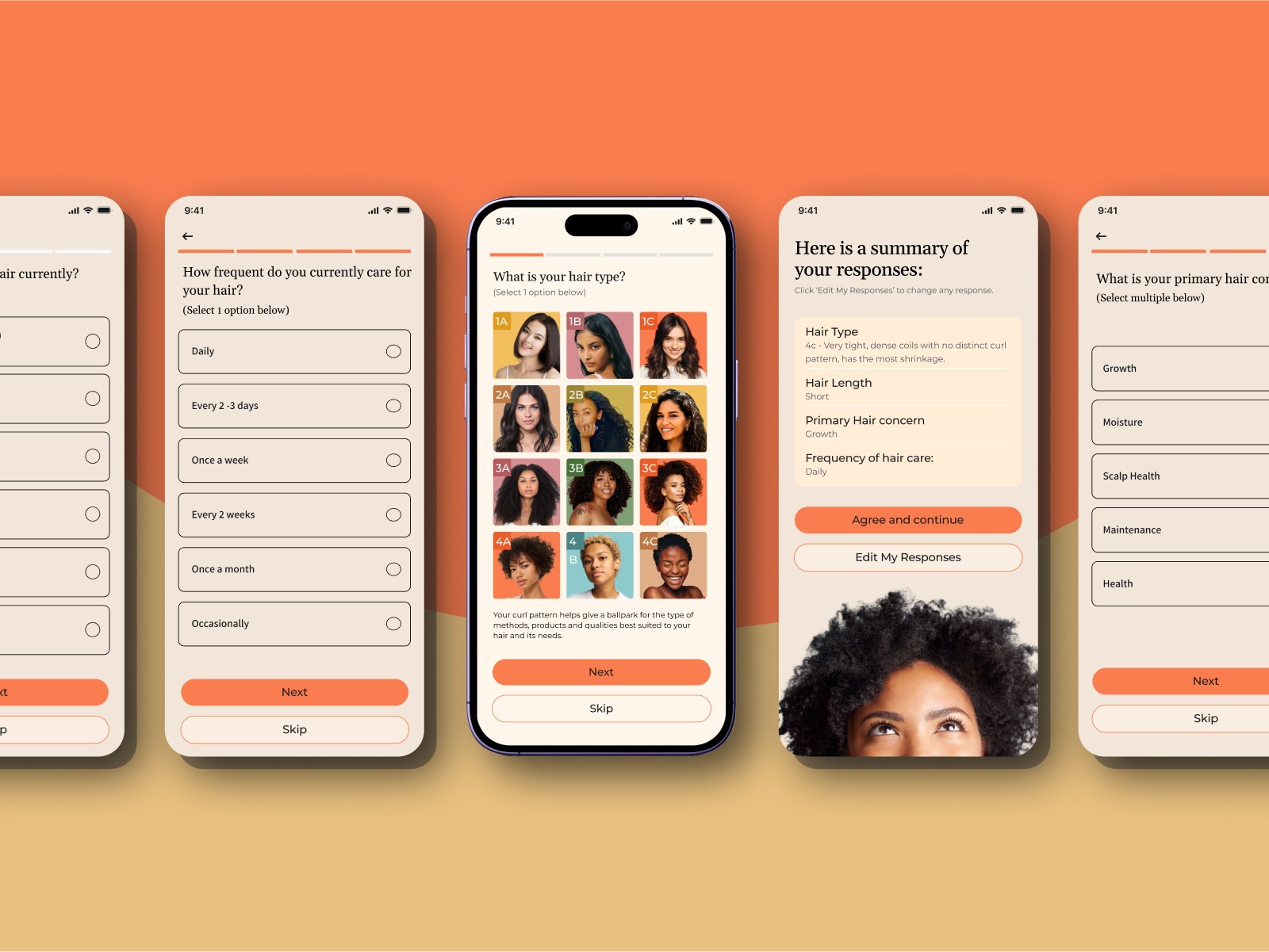 Designing Curly & Soft focuses on creating an intuitive and engaging user experience. From a seamless onboarding flow with an interactive questionnaire to a visually appealing regimen builder, the UI is structured to make personalized hair care effortless. The design prioritizes accessibility, clear navigation, and smooth interactions, ensuring users can easily find and follow expert-backed recommendations tailored to their unique hair needs.